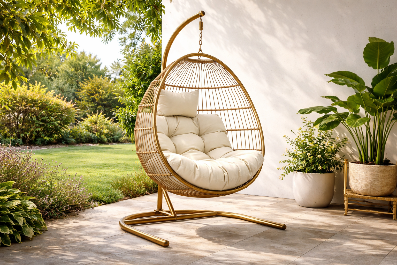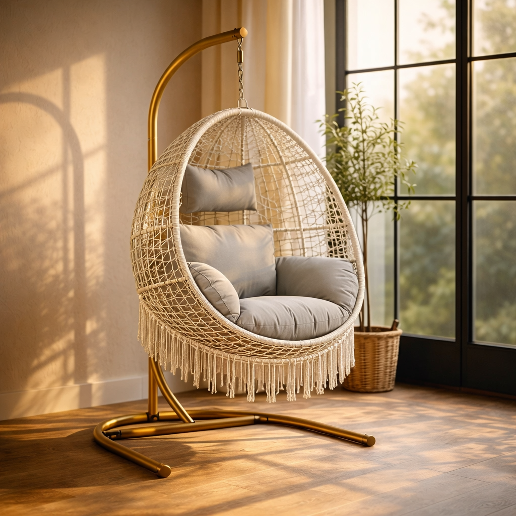 Dieser Hängesessel bietet eine bequeme Sitzmöglichkeit für Innen- und Außenbereiche. Die stabile Aufhängung und die Sitzfläche eignen sich zum Entspannen im Alltag.